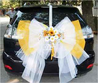 В сочетании с цветами или фигурками хорошо выглядят вуали, легкие прозрачные ткани, органза, сетка для флористики. С запада к нам пришла мода драпировать капот или багажник автомобиля фатином и тонким шелком волнами либо огромным красивым бантом с длинными, свисающими почти до земли, концами и букетом посередине. Он крепится к багажнику машины.