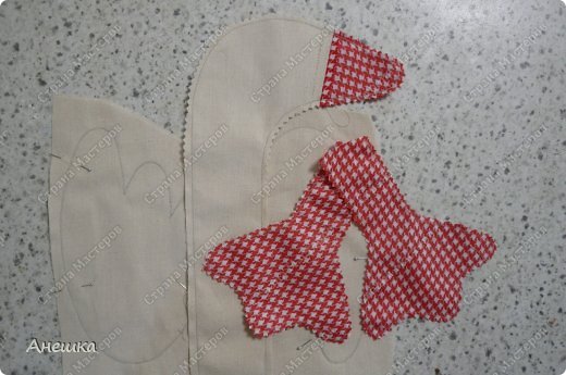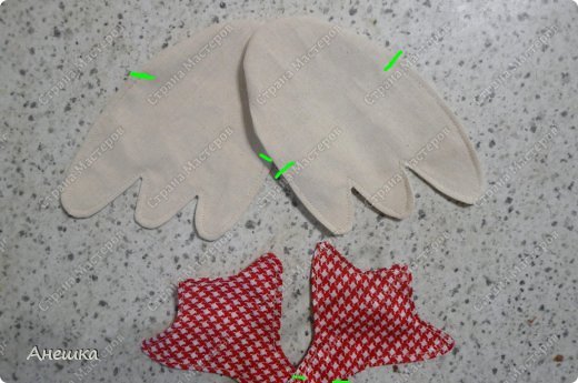Размечаем на ткани детали головы (с шеей, но без клюва) и крыльев куклы пакетницы по выкройкам в натуральную величину.
