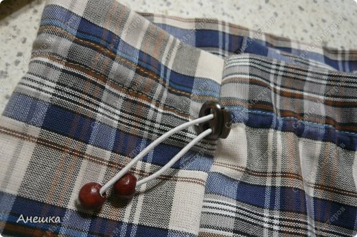 Заправляем в кулиску резинку или ленточку. Концы выводим на лицевую сторону, пропускаем через фиксатор, закрепляем на концах бусинки.