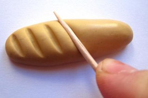 Для начала нужно подобрать цвет глины, сравнивая его с натурой (если нет подходящего, можно смешать белый, коричневый, оранжевый и желтый). Затем раскатываем шарики и пальцем приплющиваем края, чтобы они были тоньше, и их можно было завернуть (удобнее это делать кисточкой). Следующий шаг – придать “тесту” цвет поджаристой корочки с помощью пастели трех цветов.