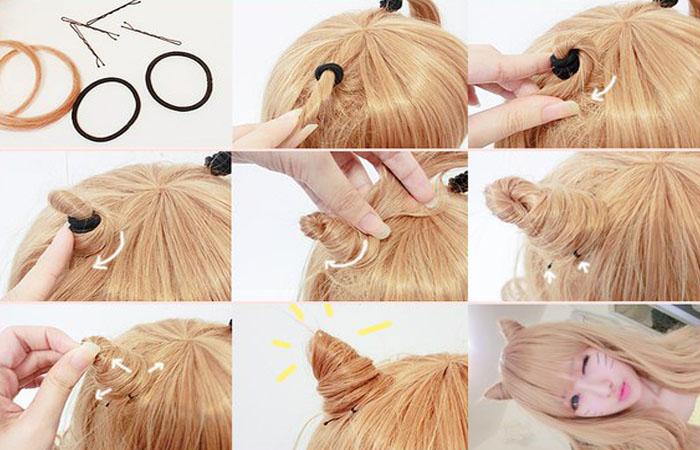 Ушки можно сделать из волос, если хватает длины: собрать в хвостики, вытянуть петельку, начесать концы и спрятать их внутрь петельки. Осталось аккуратно распрямить «ушко» веером и закрепить по краям невидимками.