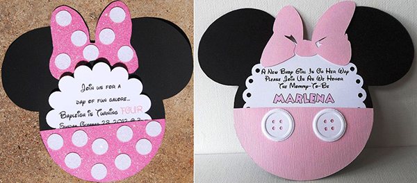 Ничуть не сложнее вырезать открытку в форме бантика, самой Минни Маус и/или ее друзей (всем разные приглашения). Необычный формат – купить тематический шарик, надуть, написать маркером текст, подсушить феном, сдуть и привязать к открытке.