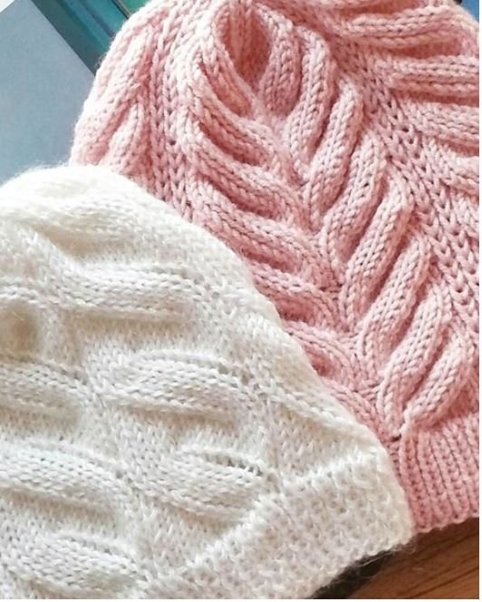 Шапка лицевой гладью с узором «перья»