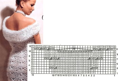 Полотно целиком вяжем своими руками, но для удобства можно использовать крючок, чтобы провязать одновременно несколько вытянутых петель. Такой орнамент используется для изготовления разных предметов одежды, шарфов или кофточек, и даже вот таких ослепительных платьев: