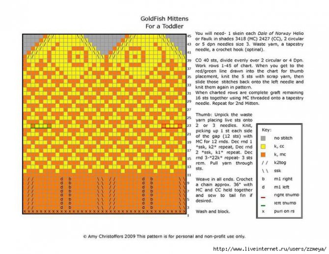Правая и левая варежки вяжутся одинаково, в зеркальном отражении. Если вы используете чулочные спицы, петли большого пальчика правой детали располагаются на третьей спице, левой — на четвертой.