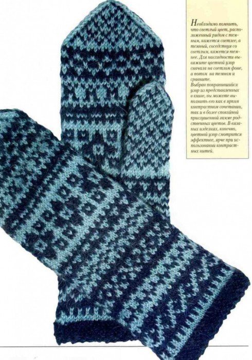 Пряжа: темно-синяя нить – 50% шерсти, 50% акрила; светло-бирюзовая – 100%-ная шерсть. На этой рукавичке 10 разных узоров, и ни один не повторяется. Орнаментальный ритм создается за счет чередования цветов: темных – на светлом фоне, светлых – на темном. При их выборе использована гармония родственных цветов. Особенность всех десяти узоров – это их технологичность (нерабочая нить тянется по изнаночной стороне не более, чем на 5-7 нетель), а также возмож-ность вывязывать их на 60 петлях, которые обычно мы набираем для вязания варежек. Девять из десяти узоров – традиционные в узорном вязании для многих регионов и районов Севера в частности.