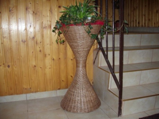 ВАЖНО: Одно из самых популярных плетеных изделий – напольная ваза, которой можно дополнить свой интерьер в доме и использовать для хранения декоративных цветов, а так же в качестве кашпо для настоящей вазы. В качестве формы вы можете использовать любые большие предметы домашнего пользования: кастрюли, вазы, тазы, ведра и многое другое.