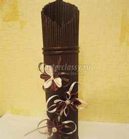 Для изготовления вазы берём бутылку от шампанского или вина и приклеиваем к ней двусторонний скотч. Клеить можно в хаотичном порядке.