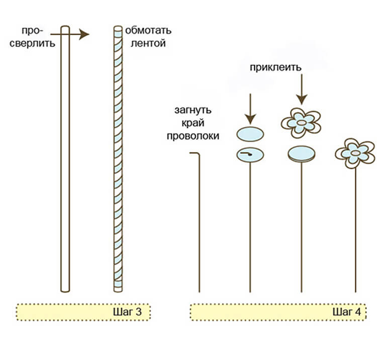 - Прикрепляют проволоку к опоре, закрепляют наматыванием. Сверху обматывают ниткой и добавляют немного клея.