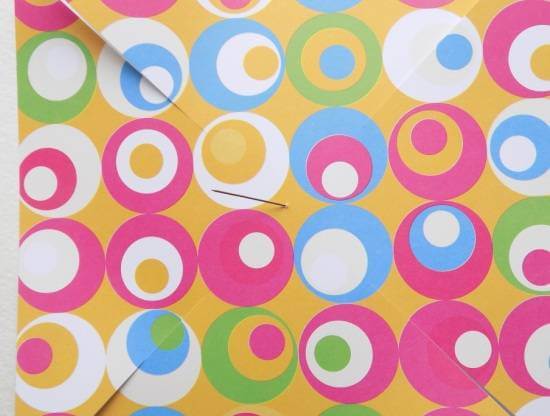 Осталось дело за малым – собрать наш ветерок из бумаги, использовав для этого тонкую швейную булавку. Намечаем центр будущей игрушки с лицевой стороны.