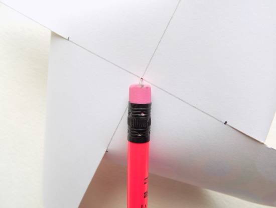 Бумага для скрапбукинга имеет две стороны: цветная и белая. Вот на белой мы как раз и будем делать все разметки. Проведем две диагональные линии, использовав простой карандаш.