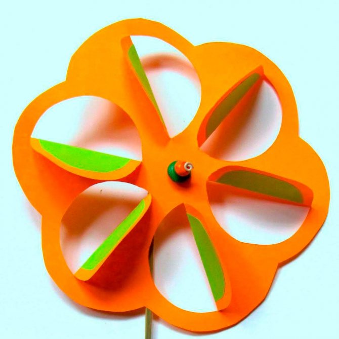 Простой вариант создания детской бумажной вертушки, которая имеет необычную формы. Лучше всего для этого подойдет яркая цветная бумага.