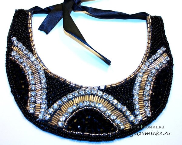 Эта модель воротничка, вышитого бисером со стразами, заслуживает внимание не только за красоту узоров, но оригинальное решение по выполнению застежки. Она сделана спереди, а не сзади, поэтому воротничок имеет выкройку соответствующую размеру ворота.