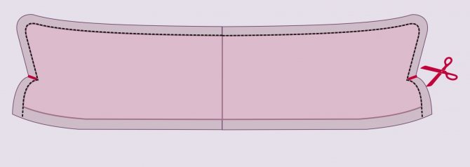 Когда вы имеете дело с воротом, который выкраивается цельно, учитывайте, что вырезав припуски, нужно выполнить надрезы по уголкам, как указано на рисунке. В обратном случае его просто нельзя будет вывернуть на лицевую сторону.