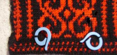 - Закончив резинку, делайте главный орнамент. Вяжите 2 ряда черного цвета, потом приступайте к жаккарду. На фото голубыми маркерами обозначена кайма.