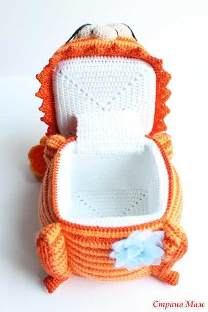 Делают 2 квадратных донышка для наружного и внутреннего чехла. Потом вяжут бортики с обеих сторон и две детали крышки. Чтобы коробка не просвечивала через связанное полотно, ее обтягивают тканью или обычной фольгой.