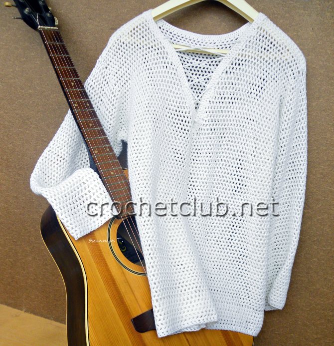 Белый мужской пуловер связала крючком Зинаида Тимошенко. Зинаида поделилась описанием и схемой вязания пуловера.