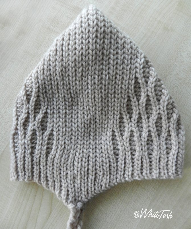 Теперь нужно разложить шапку и наметить линию расположения ушек. Она будет проходить через центр любого из клинышков, находясь на одинаковом удалении от соседних дорожек, образованных при убавлении петель. Их размеры и высота размещения определяются визуально. Для этого образца начало декоративного элемента приходится на 9-й ряд от центра, а его длина составляет 20 петелек. Набираются они по вертикальному ряду из передних стенок провязанных петель шапки. После этого работу нужно повернуть и набрать еще 20 шт., но уже из задних стенок тех же петель вязаного полотна.