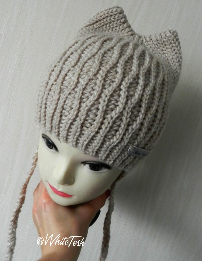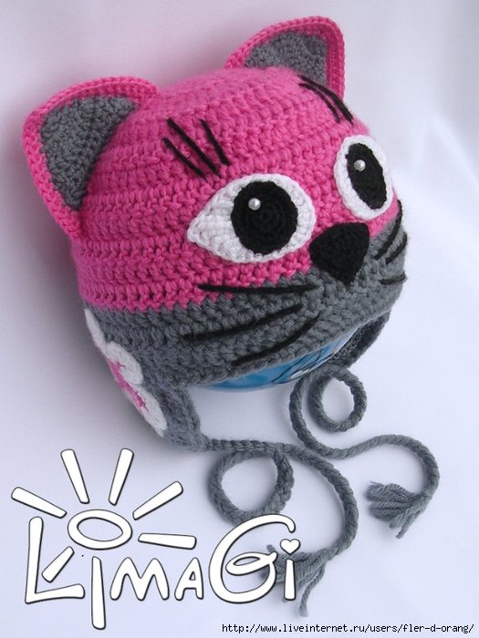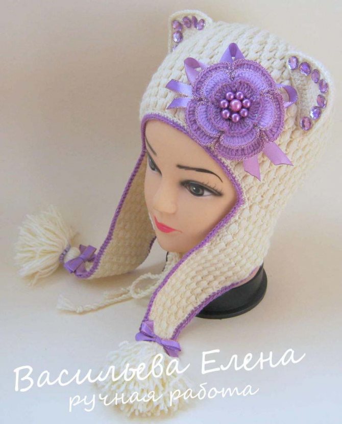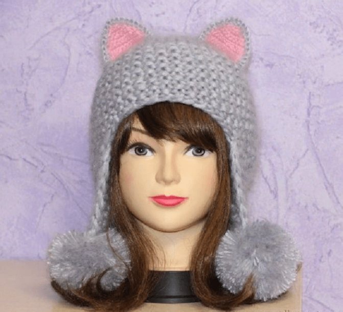 Очень красиво смотрится шапка кошечка с длинными свисающими выступами, концы которых украшены помпонами, аппликациями или каким-либо другим декором.