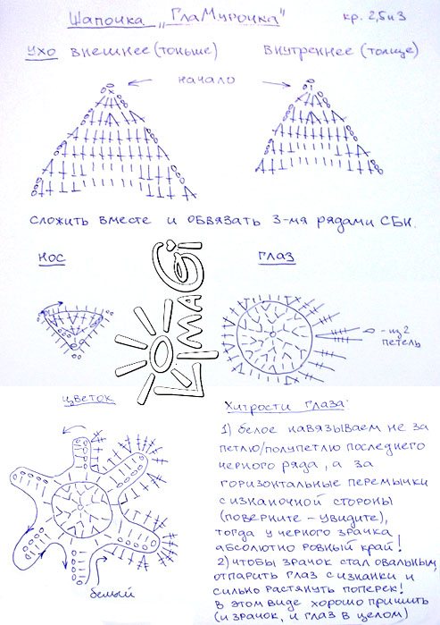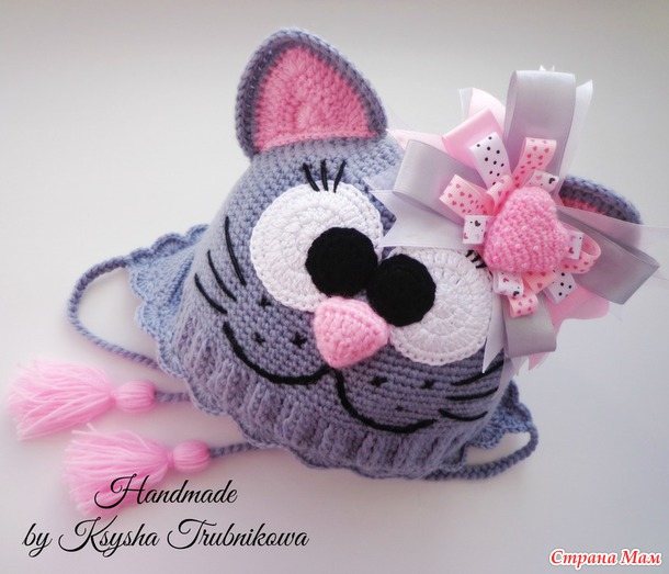 В зависимости от толщины нитки и размера крючка по одной и той же схеме у вас может получится шапки — кошки разных размеров. Пробуйте связать образец 10 х 10 см своими нитками и крючком и тогда вы сможете посчитать как изменить схему.