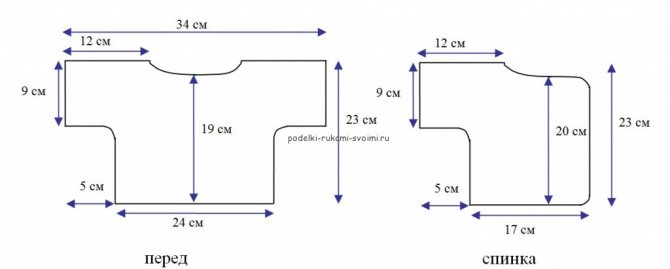 Чтобы сделать рисунок, нужно сделать точки: указать прямой угол с отрезками по 25 см вниз и справа; на горизонтальном отрезке сделать центр; на линии наметить горловину для спинки и для переда; от вершины на горизонтальном отрезке сделать линии вниз на 8 см, а от точки контура рукава и переда на 5 см и провести соединительную линию; из последнего отрезка вниз опустить угол. Выкройка для детского изделия готова. Ее можно придумать самостоятельно или найти несколько вариантов в Сети.