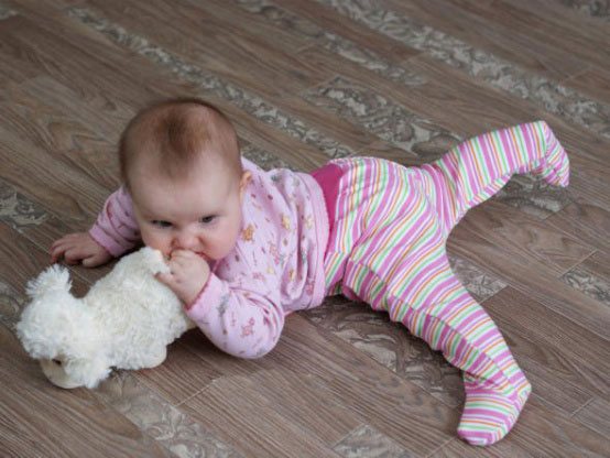- С 6 до 9 месяцев ребенок вырастает до 68−74 см, обхват его грудной клетки достигает 48 см, а головы — 40−42 см. Размер 24.