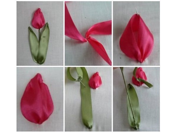 Для выполнения листьев вам нужно взять широкую, зелёного цвета, один её конец обрезать наискосок, а второй должен быть ровным. Длина отрезка примерно 15 сантиметров. Берём иглу для гобеленов, она должна быть толстой и носить примерно 6-7 сантиметров длины. Обмакиваем её в клей ПВА и то же самое делаем с ровным концом. Затем её прикладывают к ленте и равномерно наматывают нижнюю часть отрезка, в общем длина получится стебелька приблизительно около 10см. Ждут 3 минуты и легонько вытаскивают, пока клей не схватился. Таким образом у вас получается настоящий листок тюльпана, такие листья должны быть по всей длине на картине.