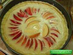 - Укладываем на тесто яблочки, поливаем заливкой.
