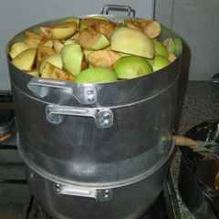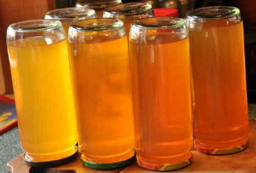 В соковарке рецепт приготовления сока также прост, нужно следовать всем его правилам, тогда получится вкусный и полезный напиток с нежным ароматом. Для этого яблоки моются, очищаются от веточек и сердцевины, после чего разрезается каждое на 6-8 частей. Все части яблок отправляются в соковарку вместе с кожурой, при необходимости (если яблоки кислые), нужно добавить сахар. Соковарка закрывается и ставится на плиту примерно на 60 минут. Затем крышку соковарки нужно снять и открыть кран, из которого сок стечет в кастрюлю. Горячий напиток разливают по стерильным банкам, консервируют и переворачивают вверх дном до полного остывания.
