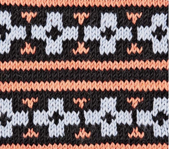 Обратите внимание: в узоре жаккарда чередуются 2 р. одного цвета и 4 р. — другого.
