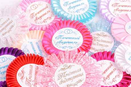 Значки можно сделать своими руками и украсить их с помощью атласных лент или разноцветных бусин. Для создания значков используйте одинаковые по размеру и форме шаблоны. Можно сделать их одинаковыми или с небольшими различиями, например, значок для свидетельницы дополнительно украсить маленькими искусственными цветочками.