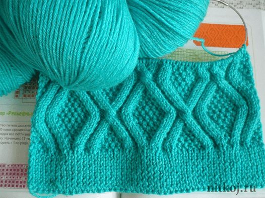 Если вы вяжете изделие с ромбами, то можете заполнить данным рельефом их внутреннюю зону. Обычно робы заполняются платочной вязкой, но данный рисунок будет смотреться гораздо эффектнее: