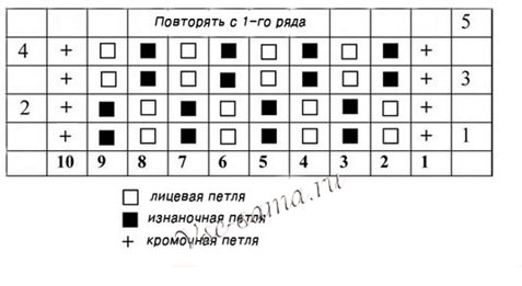 При близком знакомстве с данным рисунком можно сделать вывод, что она является разновидностью жемчужного узора. Между ними существует только одно отличие. Дело в том, что в Жемчужном выполняется чередование лицевой петли (ЛП), и одной изнаночной петли (ИП). Это чередование смещается на 1 П в каждом следующем ряду (Р). Данный орнамент отличается от жемчужного тем, что смещение петель выполняется не в каждом Р, а через полосу. Схема и техника вязания его настолько просты, что с ними справится даже самая неопытная мастерица: